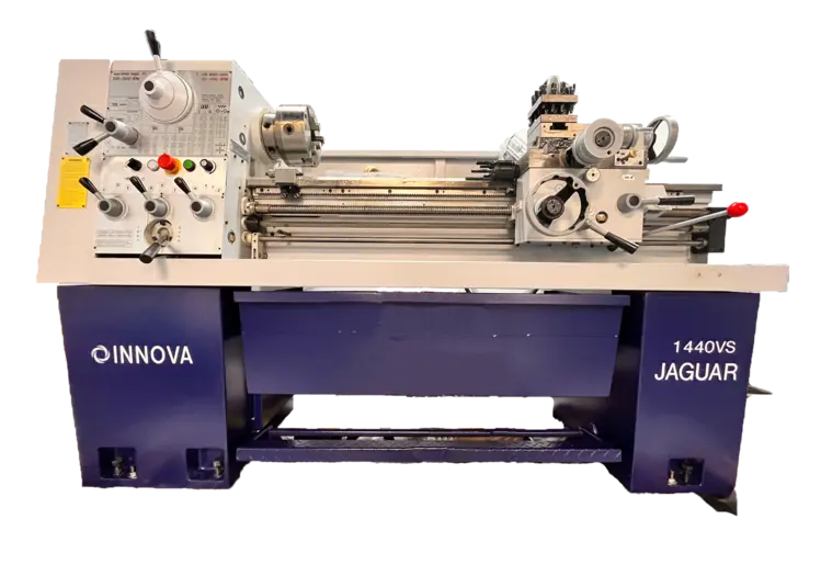 The 14" VS Innova Lathe has an integrated inverter and a two-range headstock giving you a wide selection of variable speeds. All gears are hardened and ground and run in a continual bath of oil. The spindle is made of forged, quenched, and tempered steel, with a case-hardened spindle nose and mounted on prevision taper roller bearings. The easy-to-operate control panel is designed for efficiency.